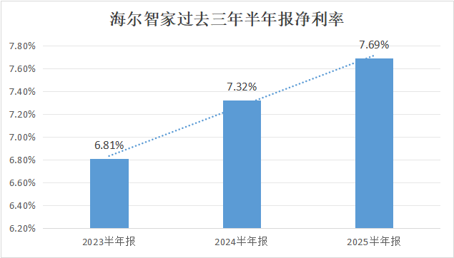 财报显示,2025年上半年,海尔智家营收1564.94亿元,同比增长10.2%,创历史新高;归母净利润120.33亿元,同比增长15.6%,同样刷新纪录。值得一提的是,海尔智家的盈利能力也在持续提升。从过去三年的半年报来看,海尔智家的净利率从6.81%提升到7.32%,再到今年的7.69%。